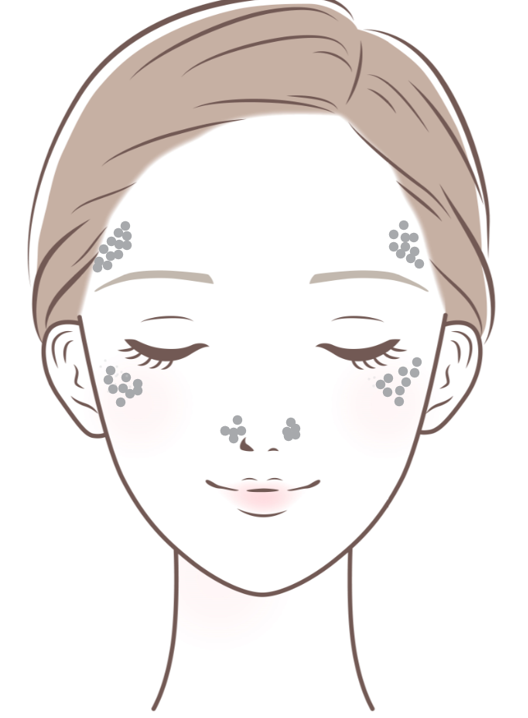 左右対称性に粒状の黒っぽいしみ。頬骨あたり、おでこの外側、小鼻に生じます。ADMはアザの一種で、その多くは成人になってから現れます。